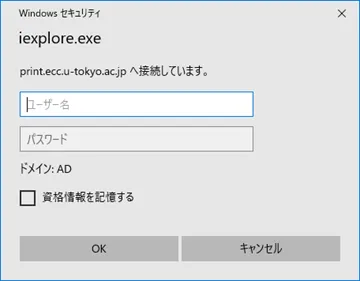 - 認証画面が表示されますので,共通ID(UTokyo Accountの先頭10桁の数字のみの部分)とパスワードをそれぞれ入力してください.画像は,表示される画面の例(Windows10の場合)です.