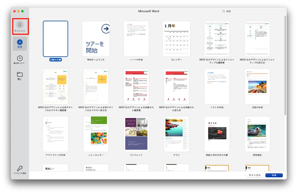 Mac環境のOfficeアプリでは,利用に際してライセンス認証のための操作は不要です.Officeアプリを起動後そのまま利用できます.
