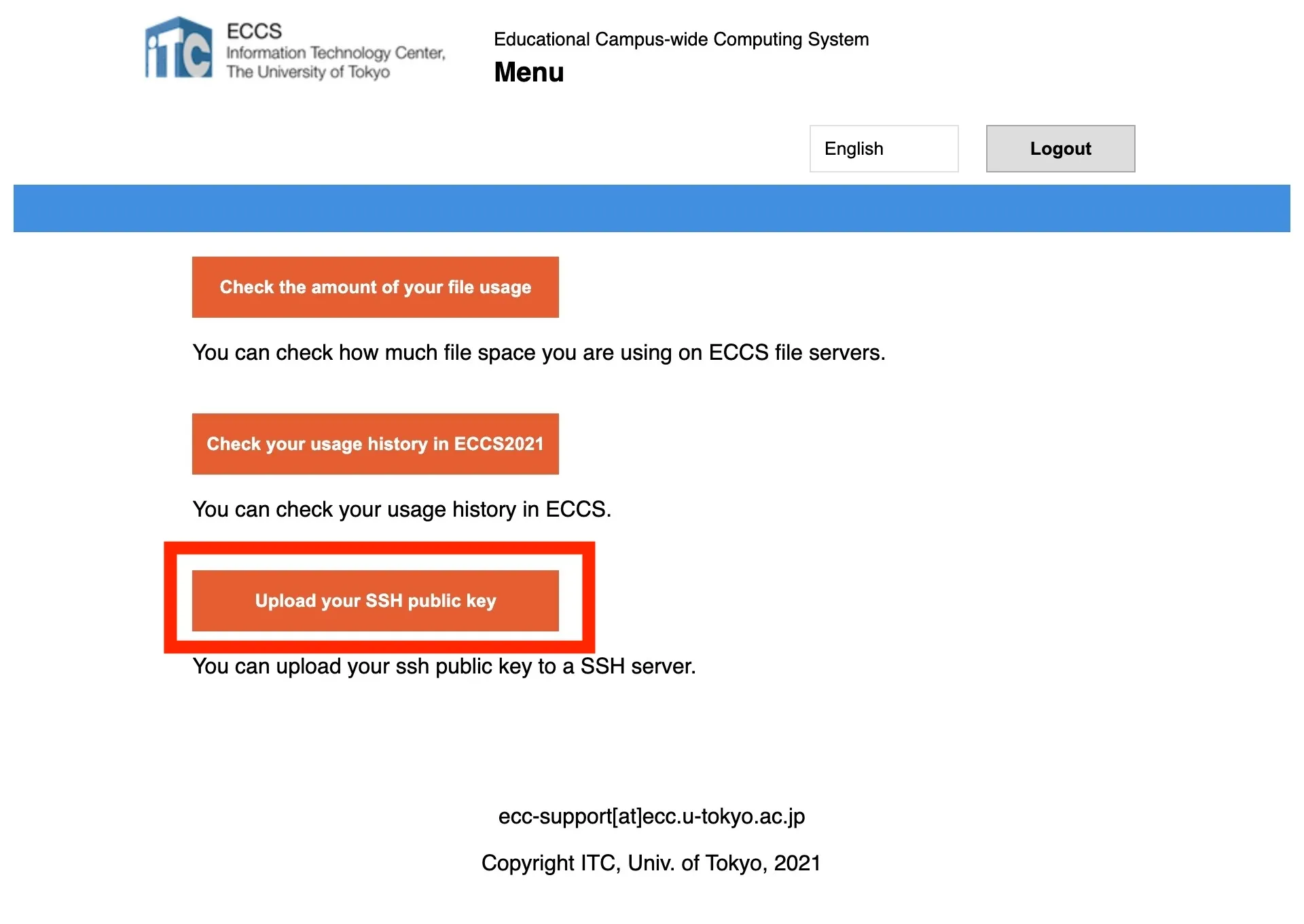 ECCSのSSHサーバは公開鍵認証によってのみ接続できます.利用に先立ち,お好きな方法で鍵ペアを作成して,公開鍵をサーバにアップロードしておく必要があります.