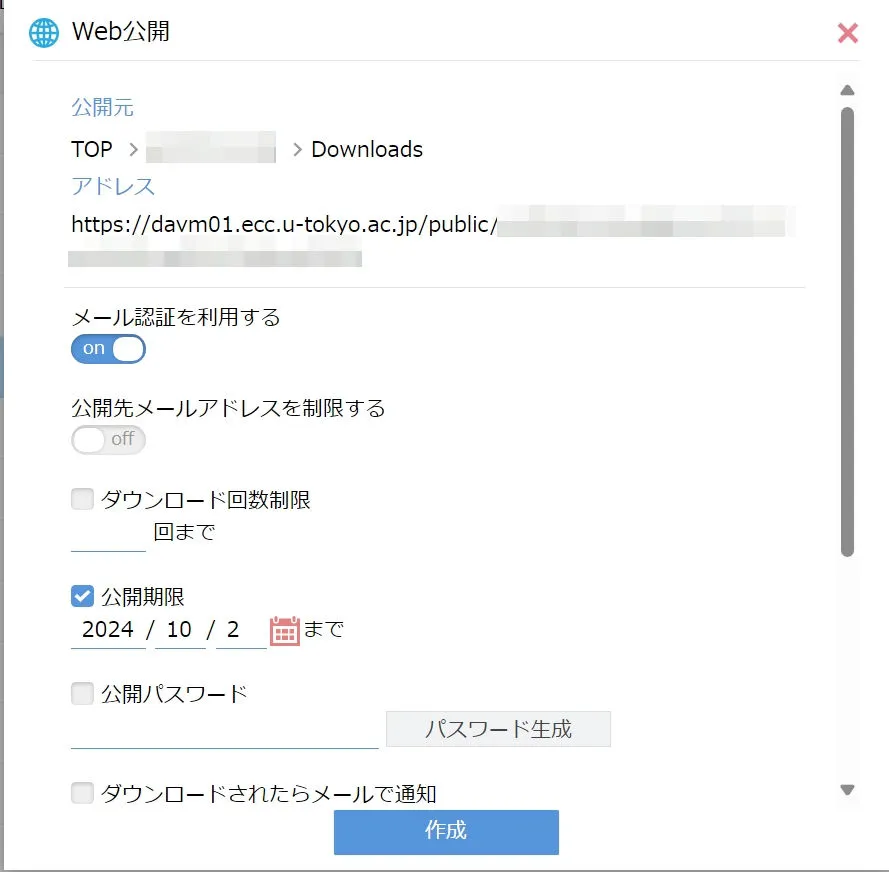 - 設定画面が表示されるので,メール認証や公開期限等を設定してください.表示されているリンクをコピーし「作成」を押してください.