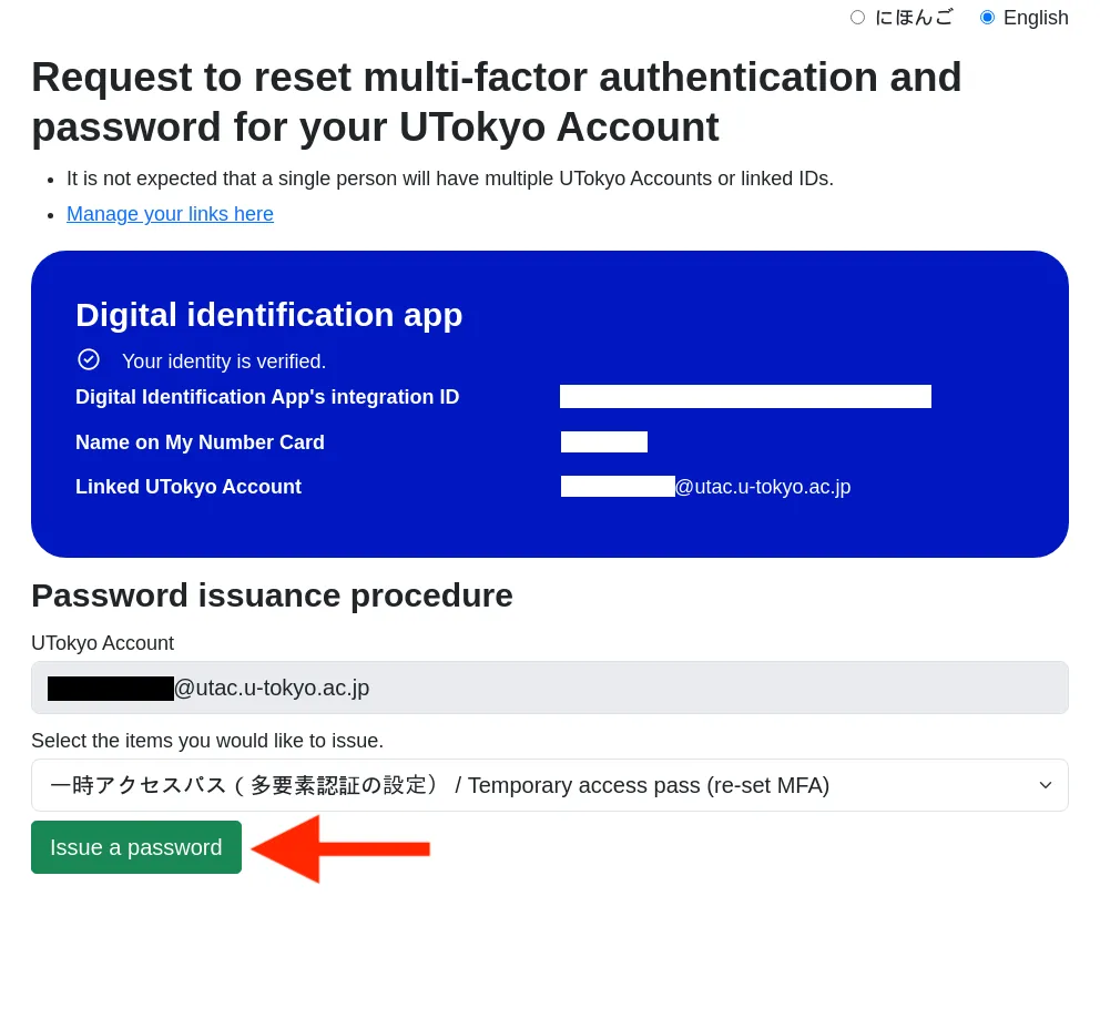 - Click “Request to reset multi-factor authentication and password for your UTokyo Account”