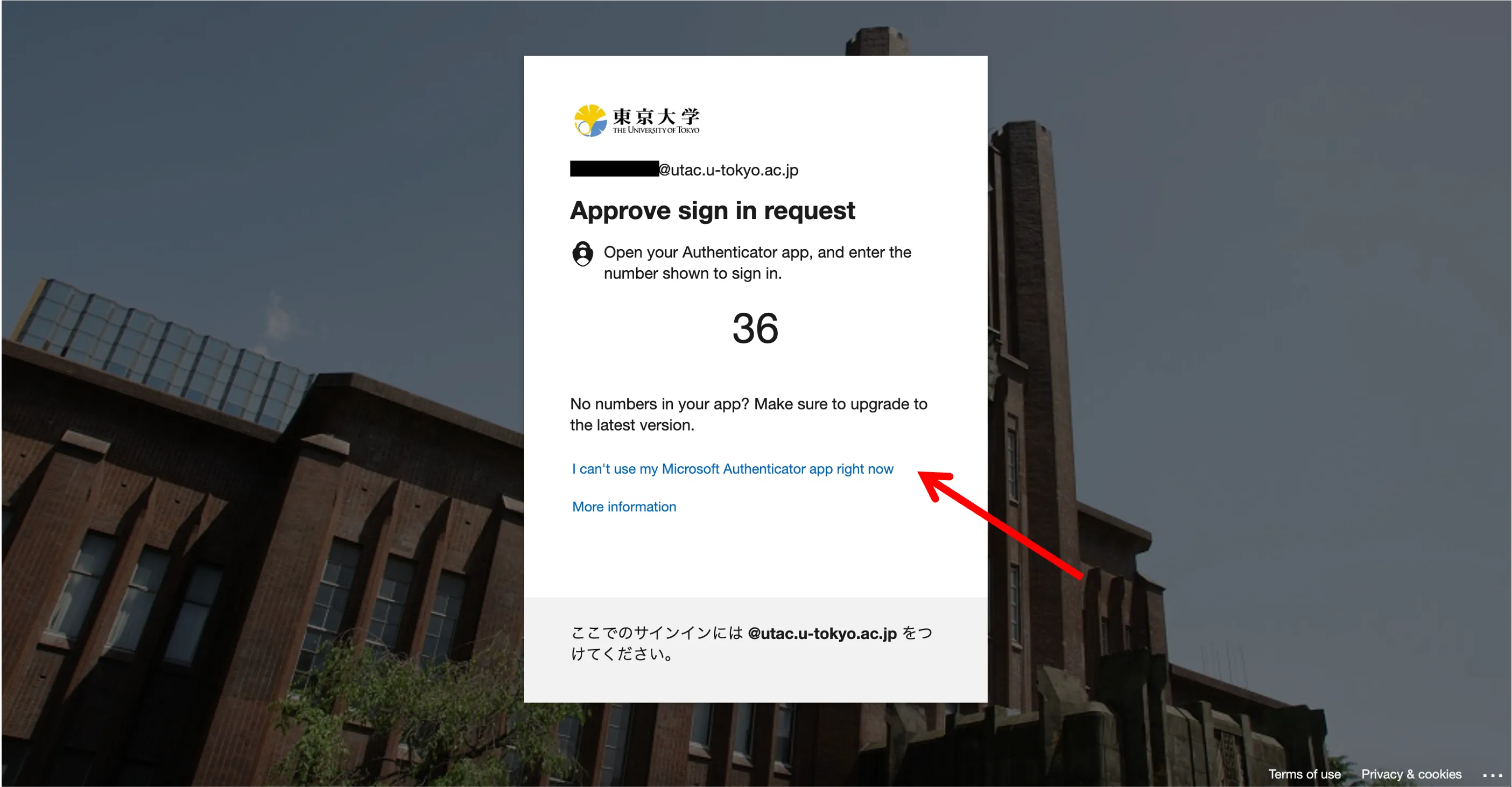 1. Once you sign in to your UTokyo Account (after you enter your password), the screen for the default multi-factor authentication verification method will be displayed. Please click on the “Having troubles? Sign in another way” or “I can’t use my Microsoft Authenticator app right now”.