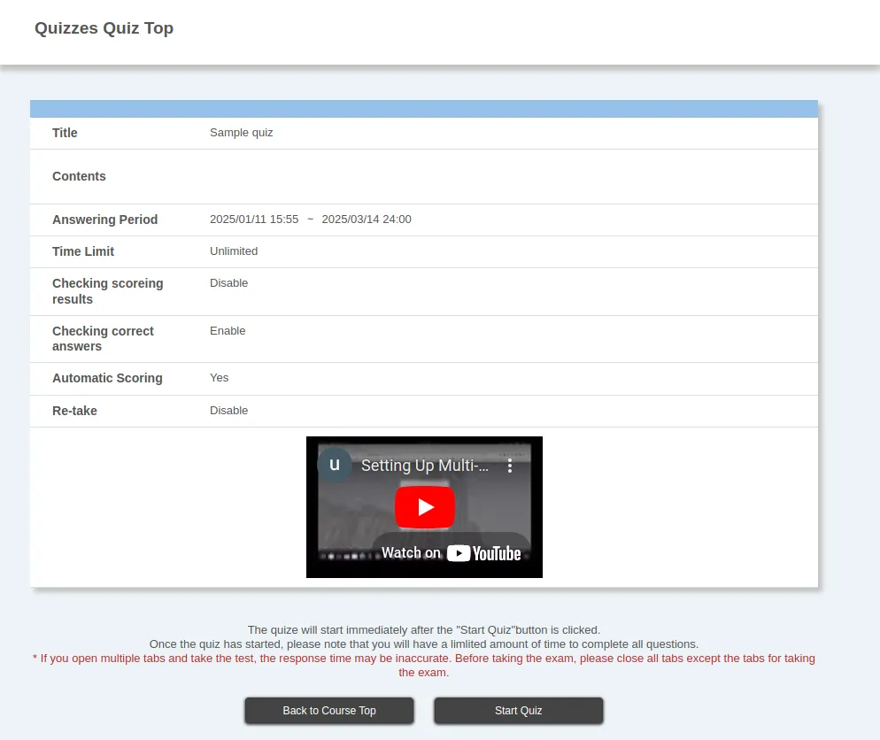 - Contents: A quiz description (supports the markup function).