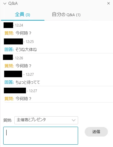 • The left photo shows how the host’s screen looks like, and the right photo is the participant’s screen. Once the questions have been answered, both the questions and answers will be shared to all participants. People who participated in the event midway can also read the past Q & As.