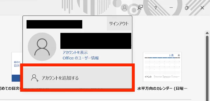OfficeアプリになんらかのMicrosoftアカウントでサインインしている状態です.右上の人型のアイコンをクリックした後,現在サインインしているアカウントを確認してください.UTokyo Accountでない別のアカウントでサインインしていた場合は「アカウントを追加する」を選択してください.