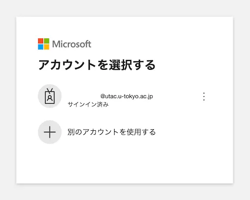 • 表示されているアカウント名を選択し,画面の指示に従ってサインインを行ってください.状況により,安田講堂の画像があるサインイン画面が表示される場合や,多要素認証(MFA)の本人確認のみが要求される場合などがあります.サインイン手順の詳細は「UTokyo Accountで情報システムにサインインする」を参照してください.