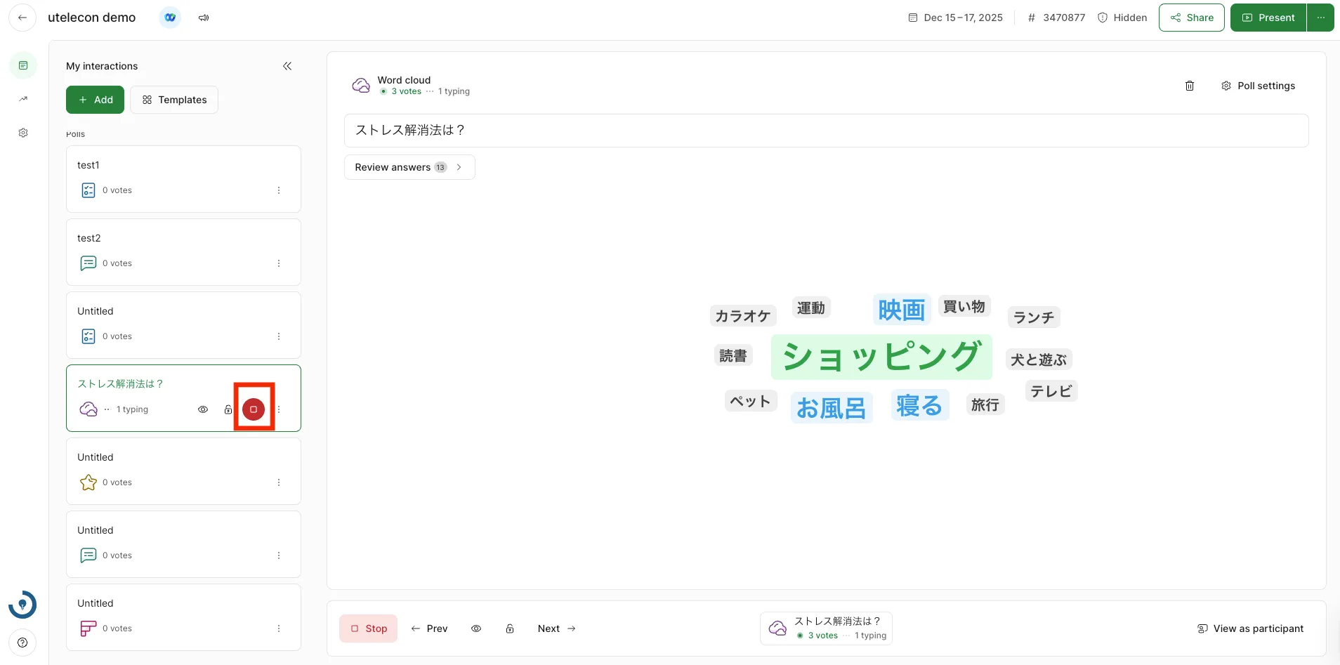赤いボタンをクリックすると,上の画像のように,画面右側に表示されていた投票が消えます.再度参加者への投票の表示を行いたい場合は,画面左側の投票についている緑色のボタン(元々赤色のボタンだったもの)をクリックして下さい.