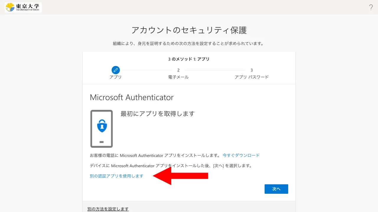 画面の中ほどにある「別の認証アプリを使用します」というリンクを探して押してください.