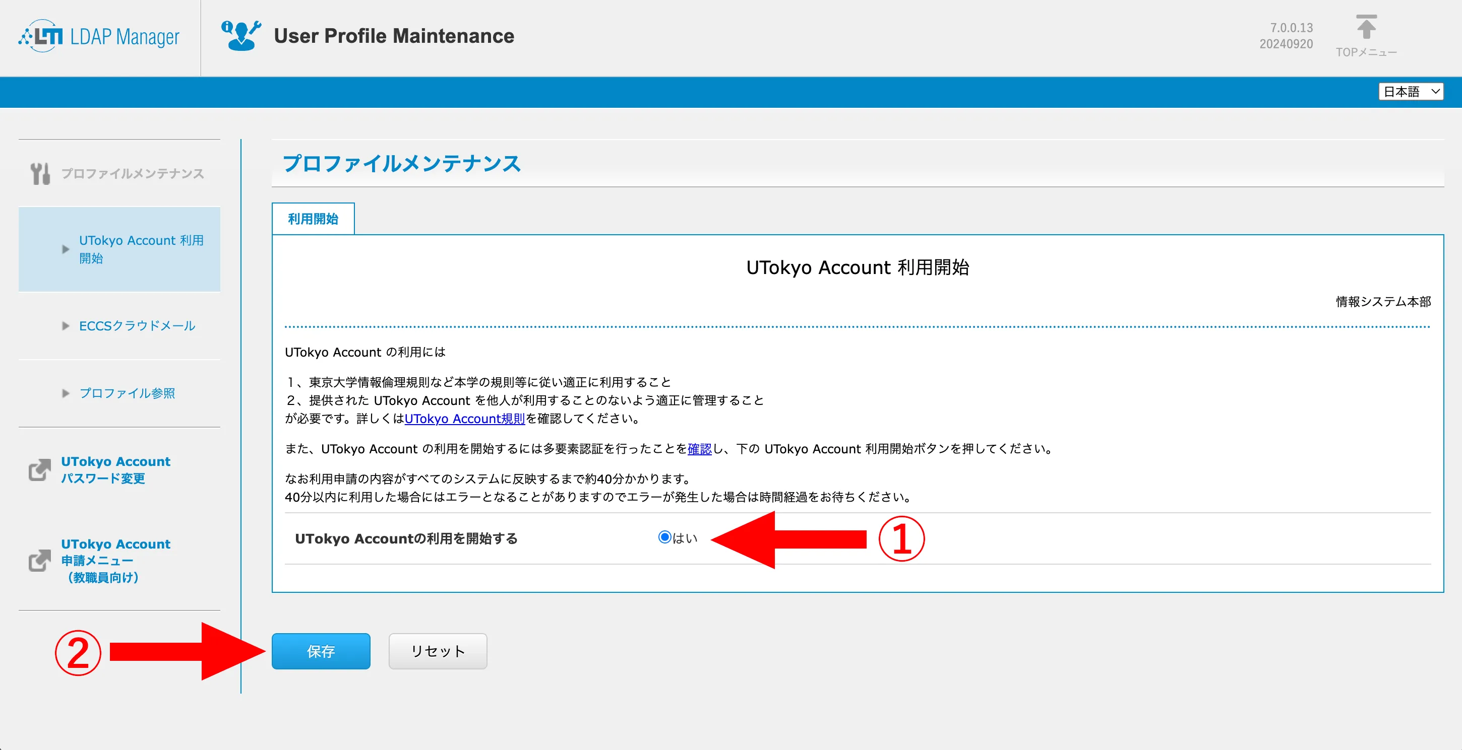 - 表示されるUTokyo Accountに関する説明をよく読んでから,下の方にある「UTokyo Accountの利用を開始する」を「はい」にして,「保存」を押してください.