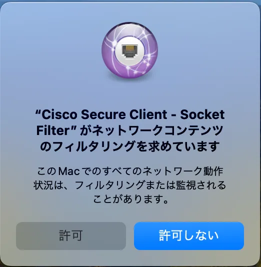 手順C: Cisco Secure Clientのインストールの途中で,以下のような「機能拡張がブロックされました」という画面が出る場合があります.その際は表示される手順にしたがって,「システム設定」→「プライバシーとセキュリティ」のペインに表示されている”Cisco Secure Client - Socket Filter”に関する許可を行なってください. また以下のような「“Cisco Secure Client - Socket Filter”がネットワークコンテンツのフィルタリングを求めています」という画面が表示されますので,これも許可してください.