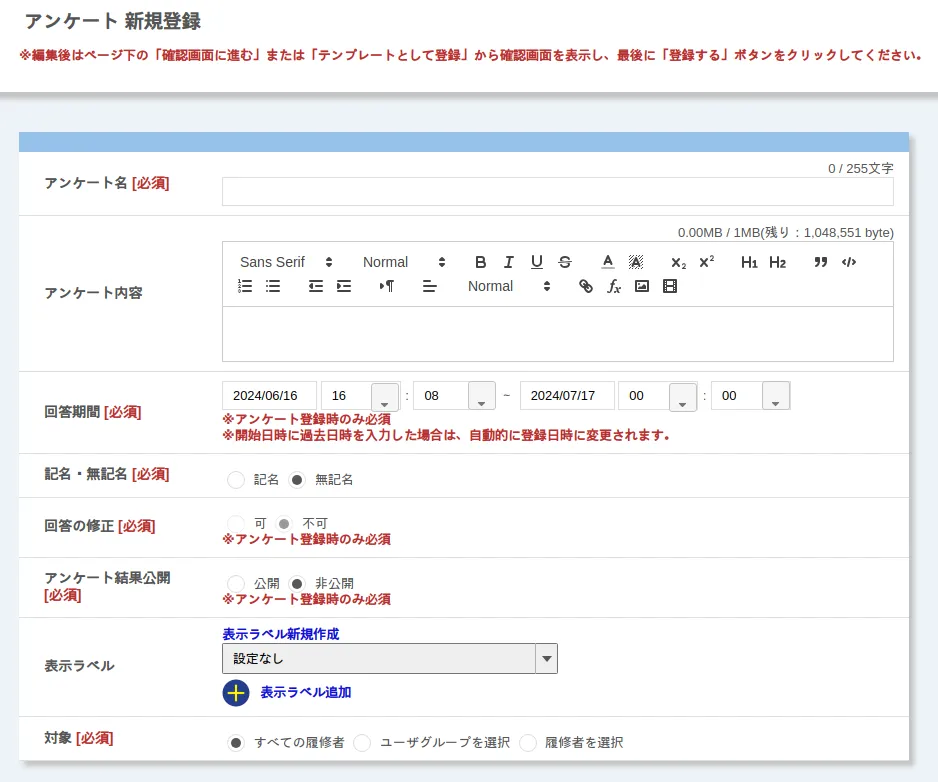 まず,アンケート全体の設定項目を入力してください.設定を行った後でも編集することはできますが,タイミングによっては編集できる項目が制限されます.詳しくは,本ページ下部「作成したアンケートを編集する」を参照してください.