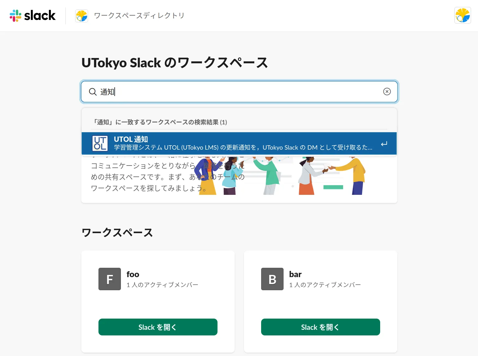 - 「UTokyo Slackに自由に参加できるワークスペースの中から選んで参加する#手順」の5. までを参考に,「UTokyo Slackのワークスペース」という画面を開いてください.
