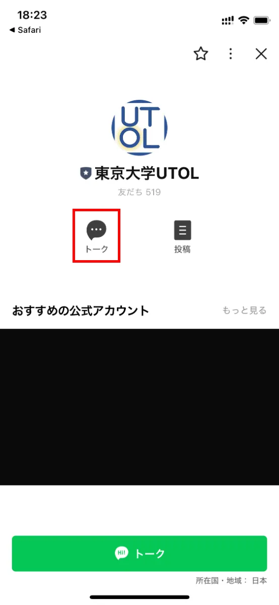 - LINEアプリを開き,「東京大学 UTOL」とのトークルームを開いてください.